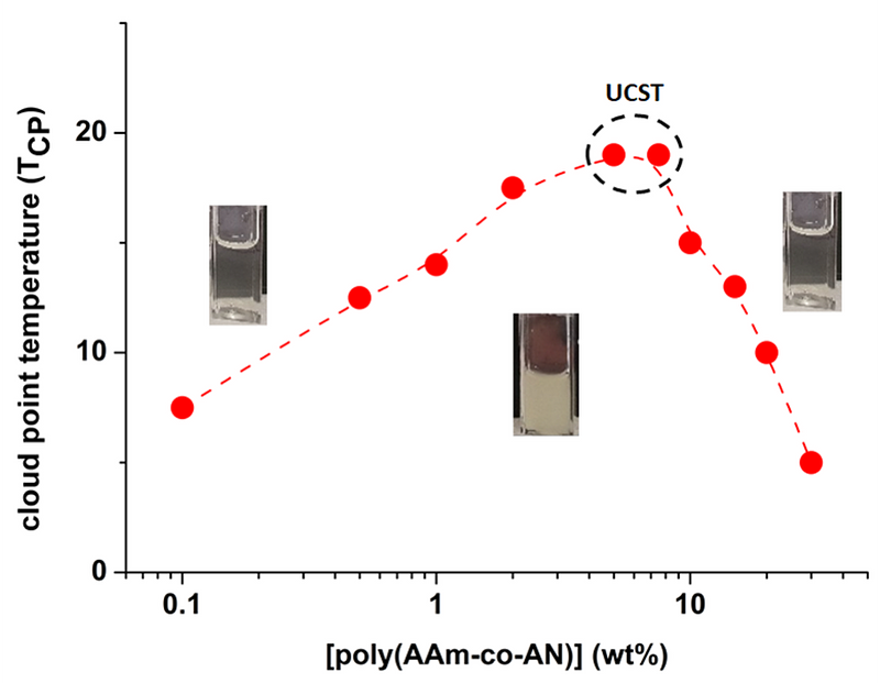 Currently, the phase transition of aqueous binary systems containing thermoresponsive (co)polymers, and exhibiting upper critical solution temperature (UCST), is exclusively investigated in dilute solutions, which can limit the knowledge of their UCST-type phase transition. Herein, a photo-RAFT polymerization approach, using acrylamide (AAm) and acrylonitrile (AN) as monomer models, is used to prepare well-controlled poly(AAm-co-AN) copolymers "in situ" in highly concentrated dispersions (60 wt%). The impact of the copolymer concentration and the chemical composition (as a variation of AN fraction in the copolymers) on the cloud point temperature (TCP ) are investigated using turbidity measurements. Importantly, the results show that upon increasing the polymer concentration, a sharp increase of TCP up to a maximum point is observed, representing the UCST, before the decrease of TCP at higher polymer concentrations. Finally, a model equation is developed to fit the UCST values of poly(AAm-co-AN), which can be useful to design new poly(AAm-co-AN) copolymers with a desired UCST for a specific application.